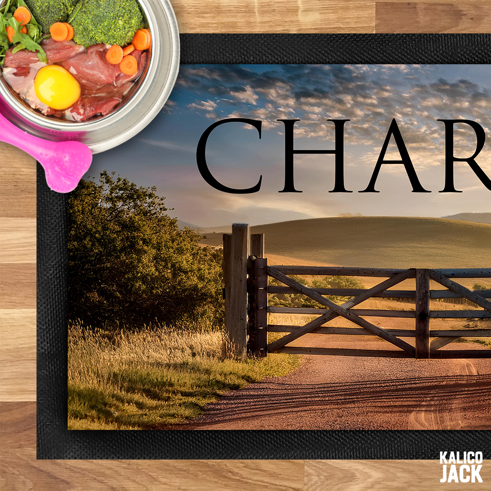 Add your dog’s name to create a feeding space that feels truly theirs. Whether your pup is a farmyard explorer, a muddy-paw adventurer, or a sofa-loving country soul, this design gives their feeding area a classic, homely feel.